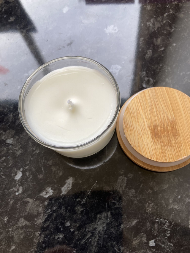 Natural soy wax candle in the glass jar with bamboo lid and with Rosemary& Lemongrass essential oils